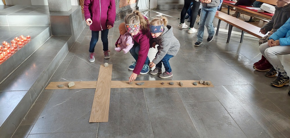 Andächtig sind wir gemeinsam mit Jesus auf seinen letzten schweren Weg gegangen, den Kreuzweg. Dabei haben wir gemeinsam ein Kreuz mit Hölzern, Seilen, Kerzen, Steinen und roten Herzen verziert. Ostern verändert die Bedeutung des Kreuzes von Hilflosigkeit, Leid, Verzweiflung, Tod hin zu einem Zeichen für neues Leben, das stärker ist als der Tod. Dies haben wir mit Tulpen versucht zu gestalten, damit wir neuen Mut, Kraft und Glauben erhalten. Mit einem gemeinsam gesungenen "Vater unser" haben wir der Verbindung zu Gott und der Kirche Ausdruck verliehen.